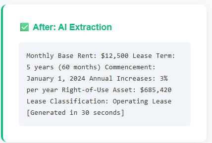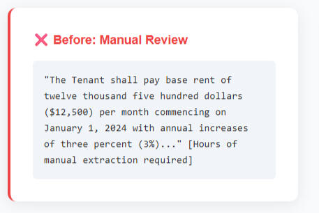 Reduce manual lease review time from hours to minutes. Focus on analysis instead of data entry.